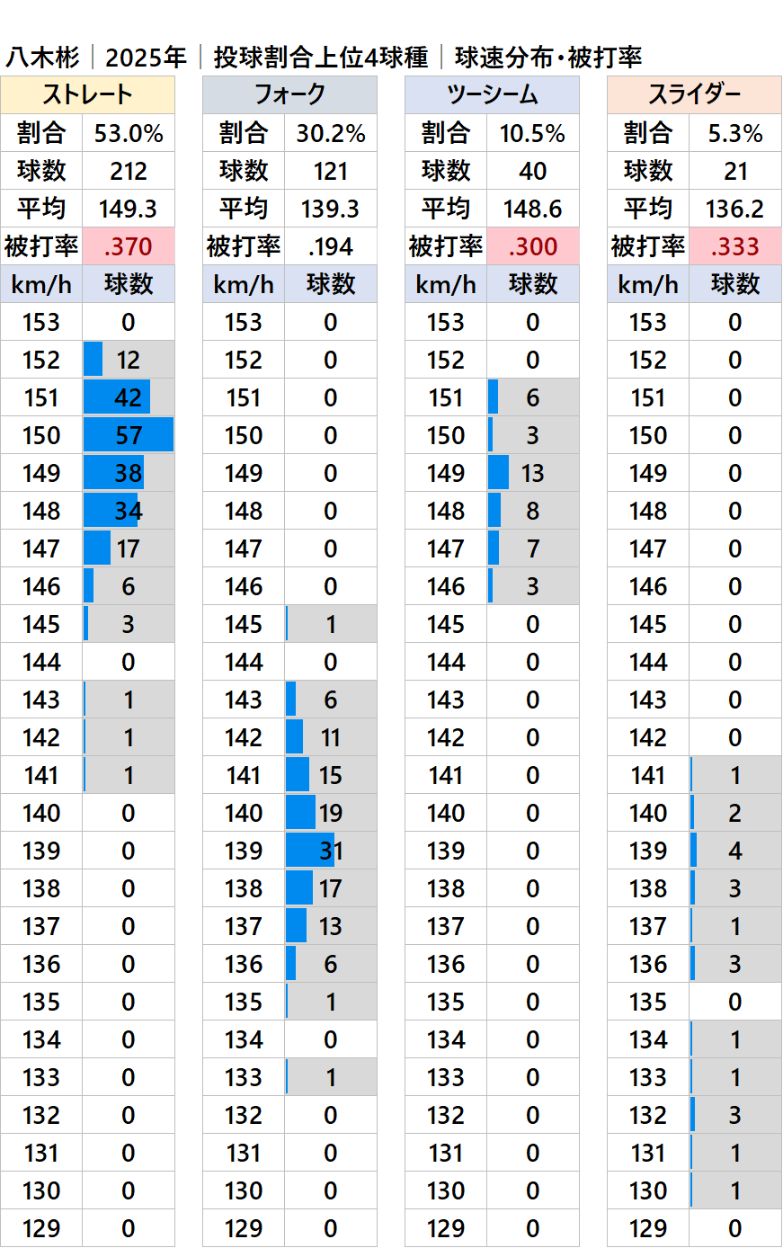 球種別球速・投球割合・被打率