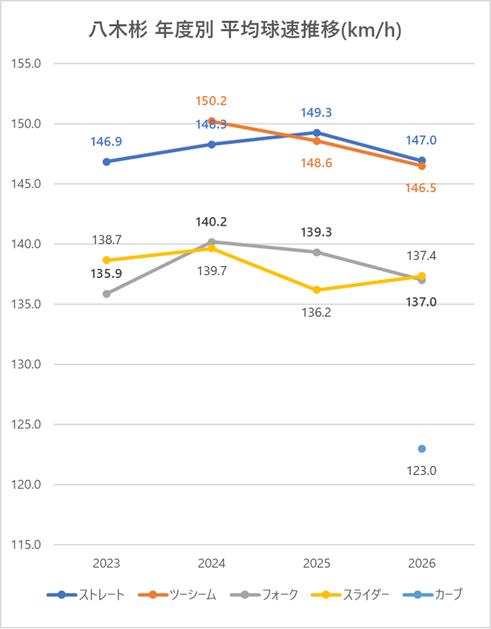 ストレートの平均球速は2024年と比較し1km/h上昇。
