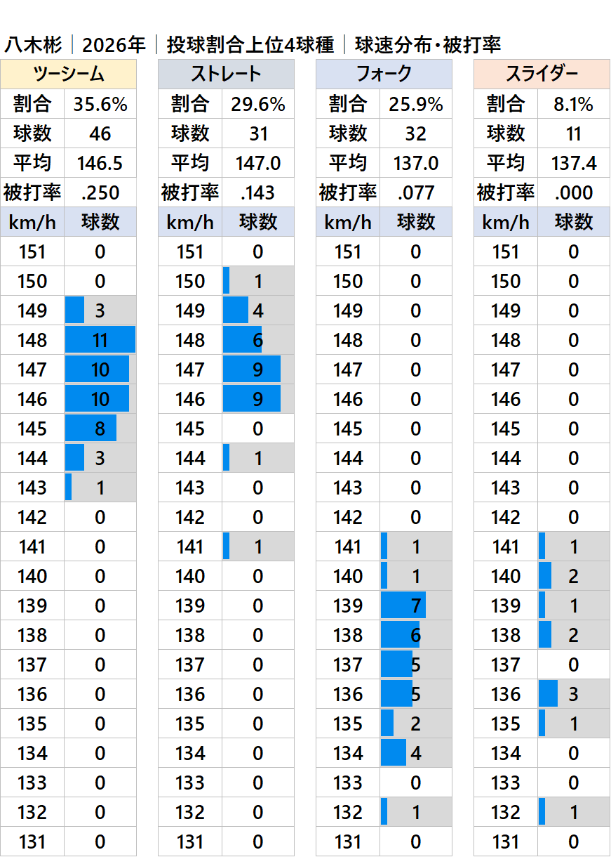 球種別球速・投球割合・被打率