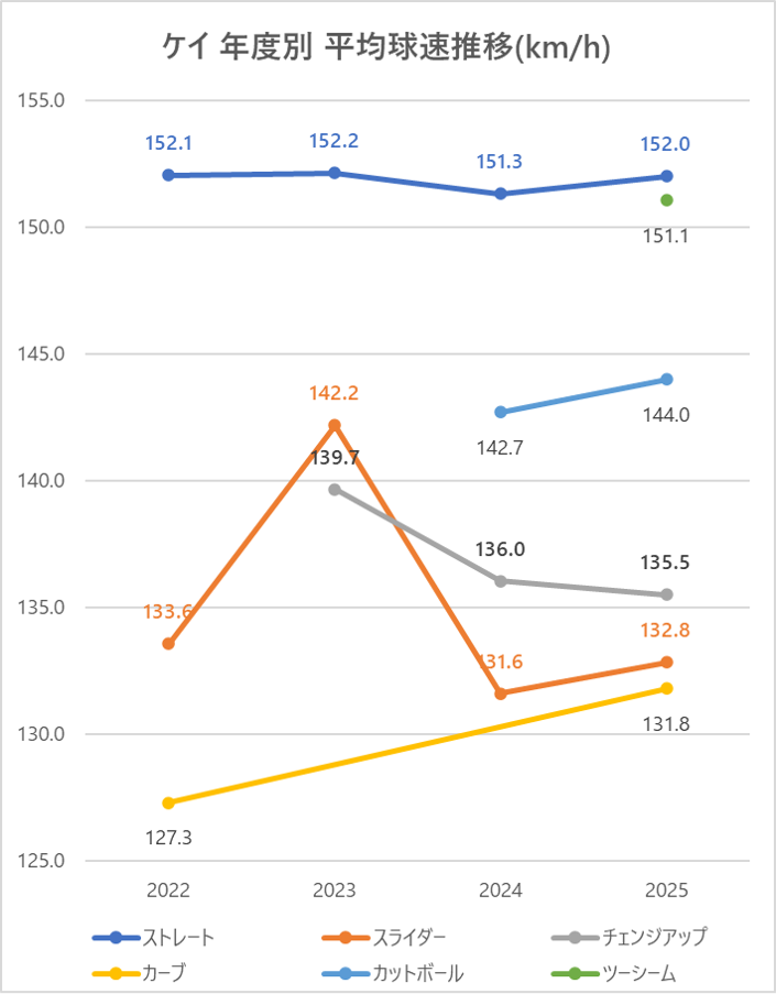ストレートの平均球速は2024年と比較し0.7km/h上昇。