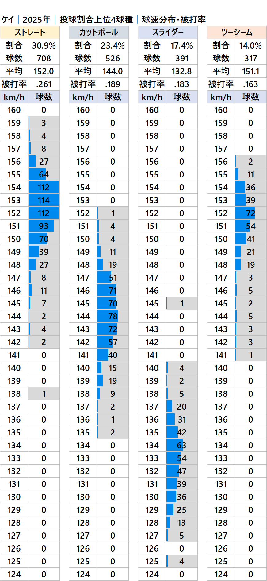 DeNAのケイ投手の2025年シーズンの球種別の投球割合・球速・被打率の情報です。