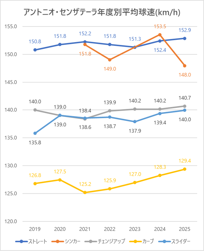 ストレート(4シーム)の平均球速は2024年と比較し0.5km/h上昇。