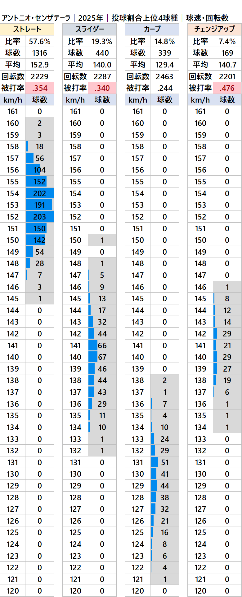球種別球速・投球割合・回転数・被打率