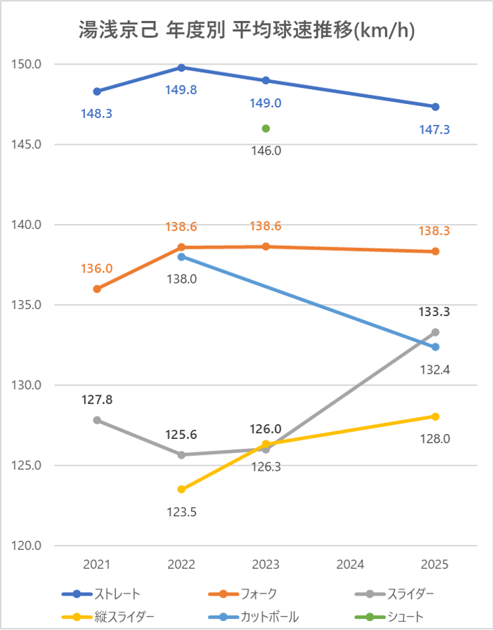病気による離脱前の2023年と比較しストレートの平均球速は1.7km/h低下。