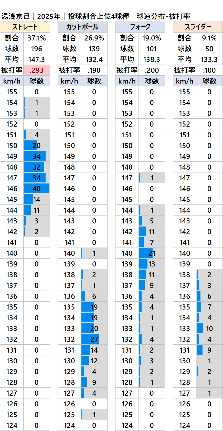 阪神の湯浅京己投手の2025年シーズンの球種別の球速・投球割合・被打率の情報です。