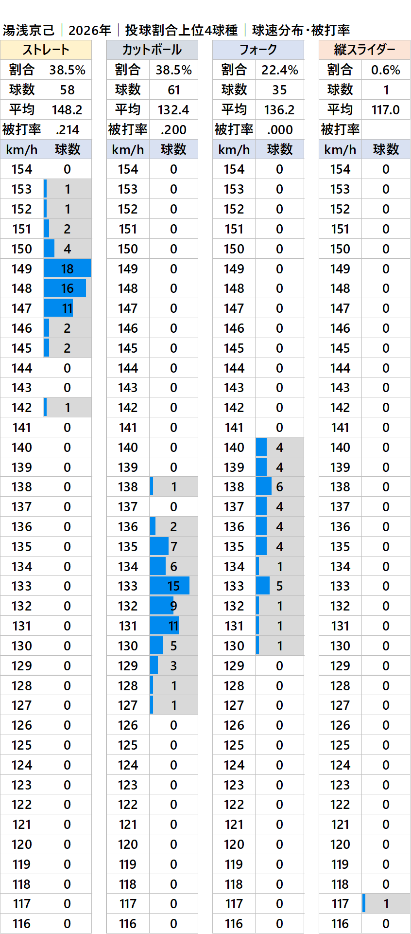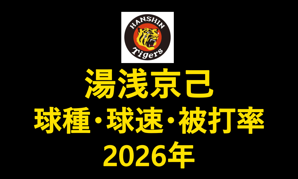 阪神の湯浅京己投手(右投)の2026年シーズンの球種別の球速・投球割合・被打率の情報です。