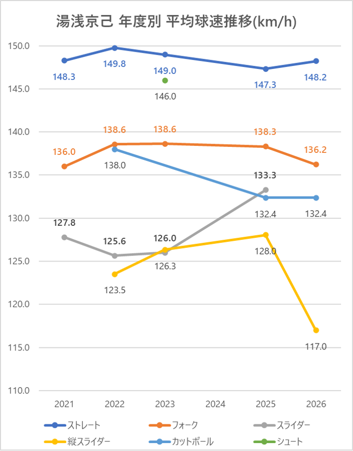 2025年と比較しストレートの平均球速は約1km/h上昇。