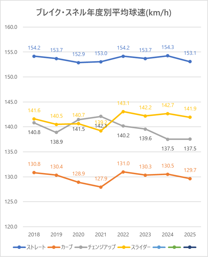 ストレート(4シーム)の平均球速は2024年と比較し1.2km/h低下。