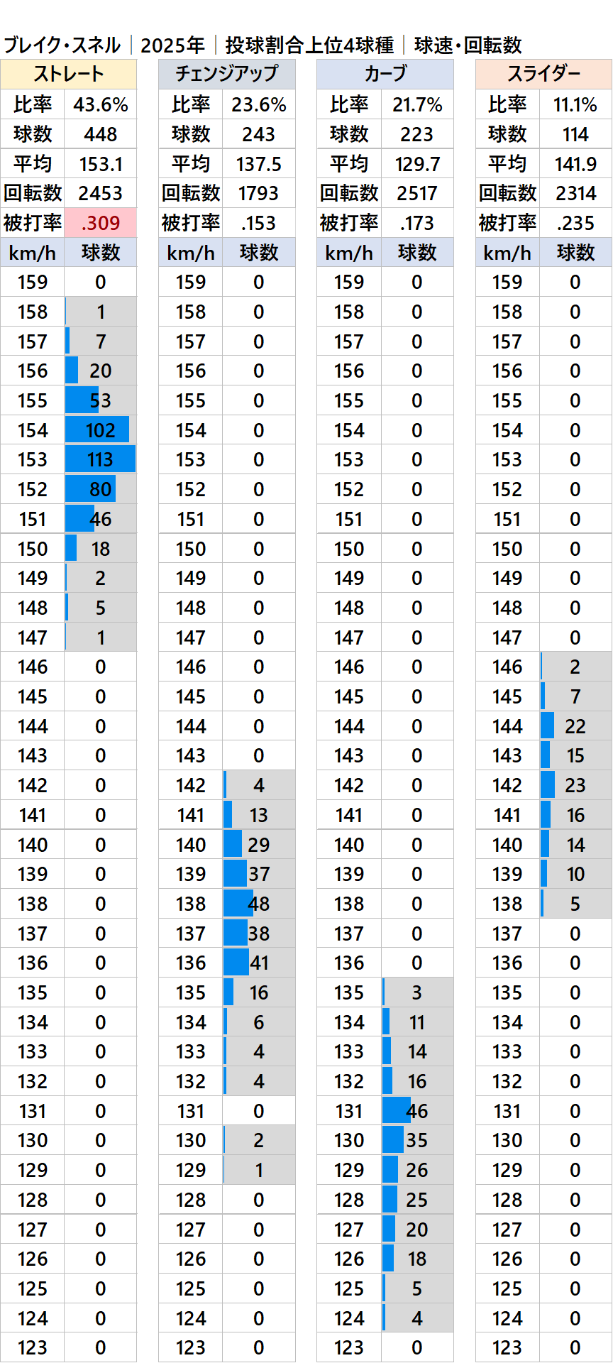 ドジャースのブレイク・スネル投手の2025年シーズンの球種別の投球割合・球速・回転数・被打率の情報です。