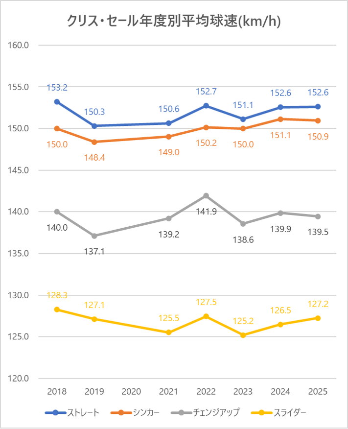 ストレート(4シーム)の平均球速は2024年と比較し横ばい。