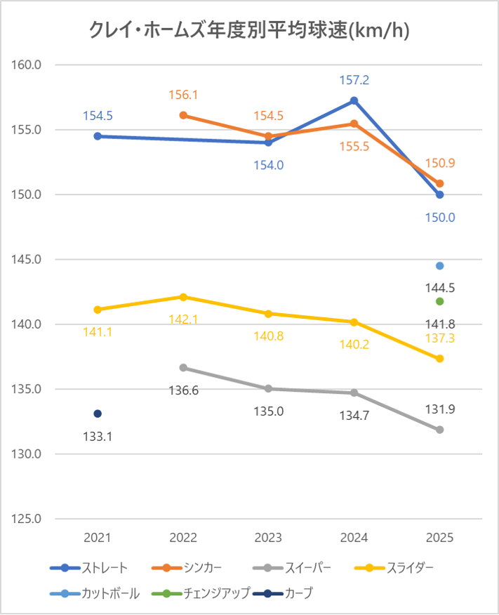 リリーフだった2024年と比較し、シンカーの平均球速は4.7km/h低下。