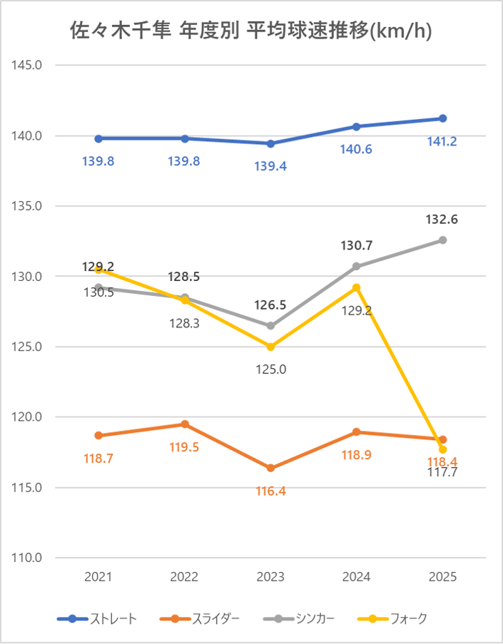 ストレートの平均球速は2024年と比較して0.6km/h上昇。。