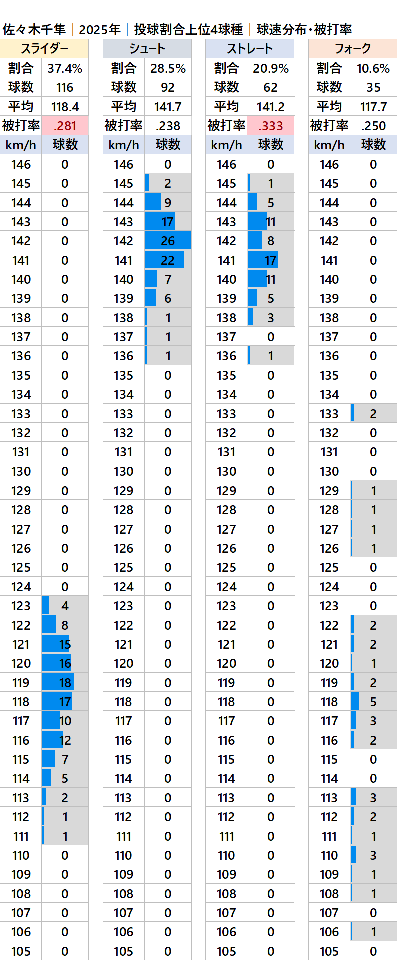 DeNAの佐々木千隼投手の2025年シーズンの球種別の投球割合・球速・被打率の情報です。