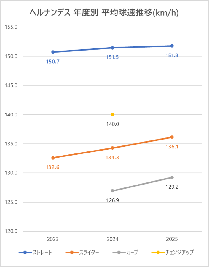 ストレートの平均球速は2024年と比較し横ばい。