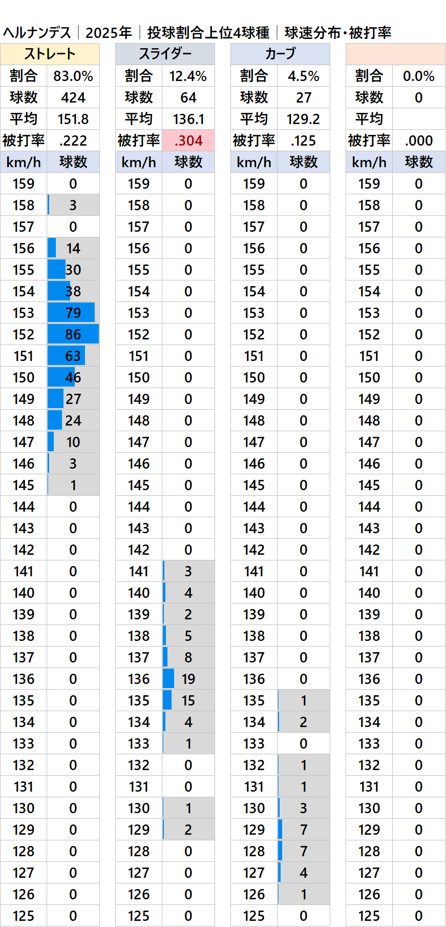 ソフトバンクのヘルナンデス投手の2025年シーズンの球種別の投球割合・球速・被打率の情報です。