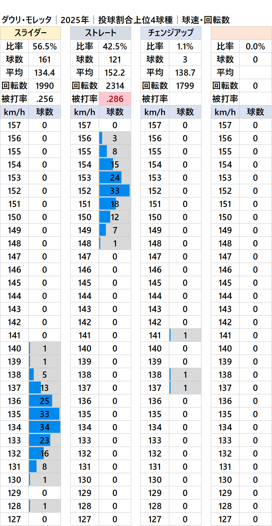 2026年シーズンより阪神に加入するダウリ・モレッタ投手(右投/ドミニカ共和国)の2025年シーズンの球種別の投球割合・球速・回転数・被打率の情報です。