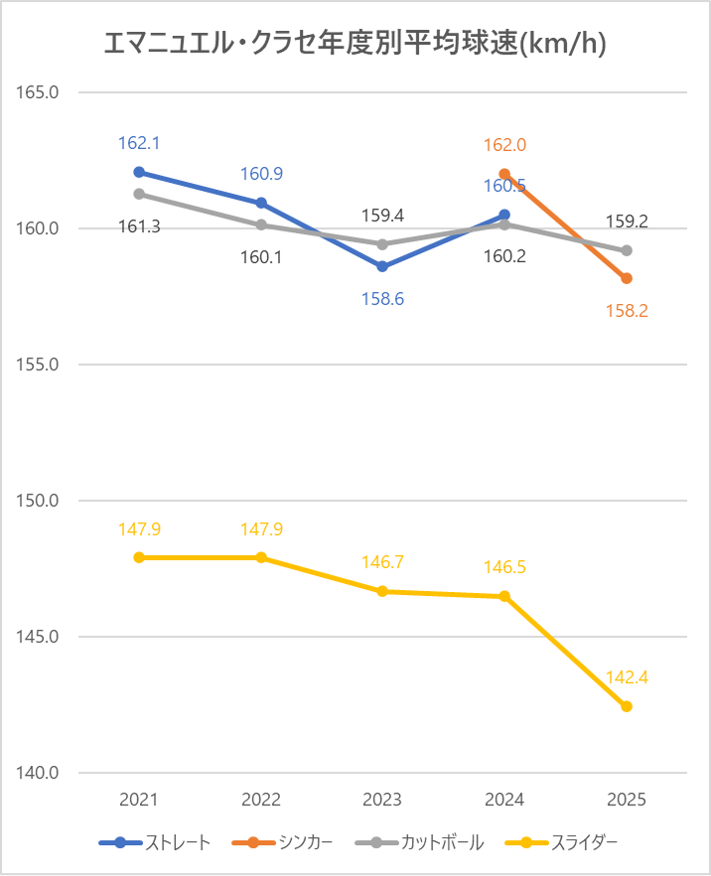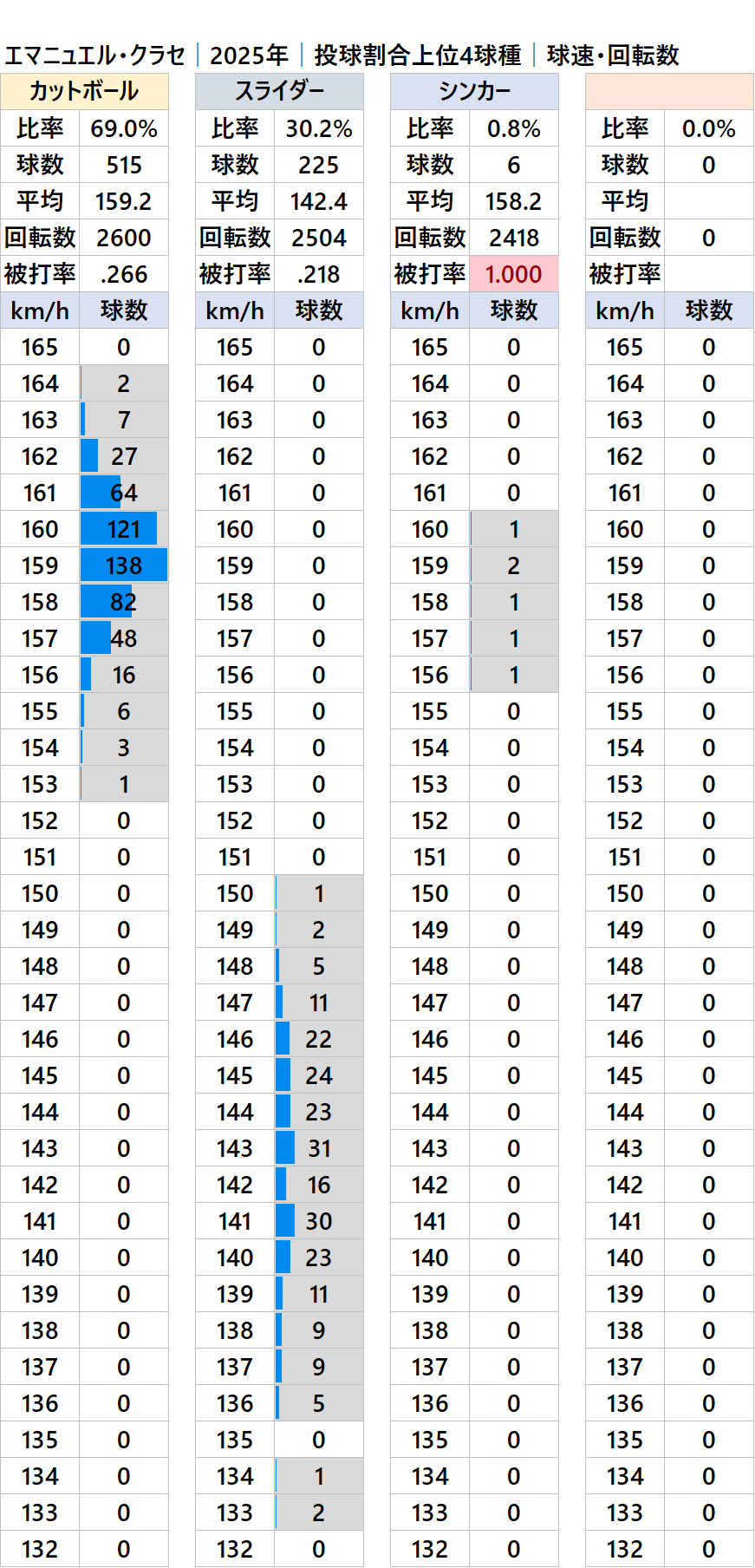ガーディアンズのエマニュエル・クラセ投手の2025年シーズンの球種別の投球割合・球速・回転数・被打率の情報です。