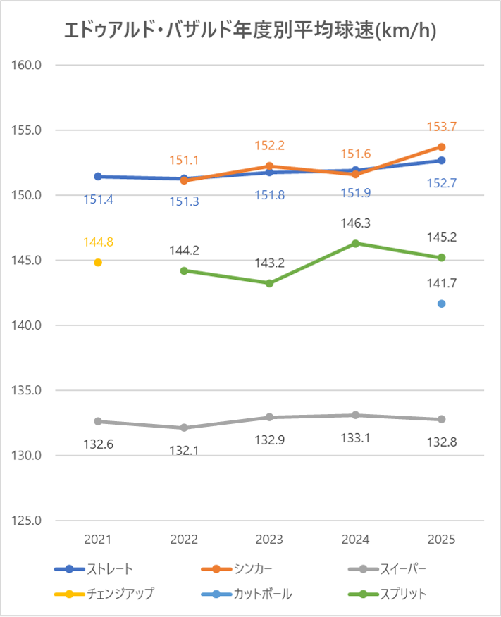 シンカー(2シーム)の平均球速は2024年と比較し2.1km/h上昇。