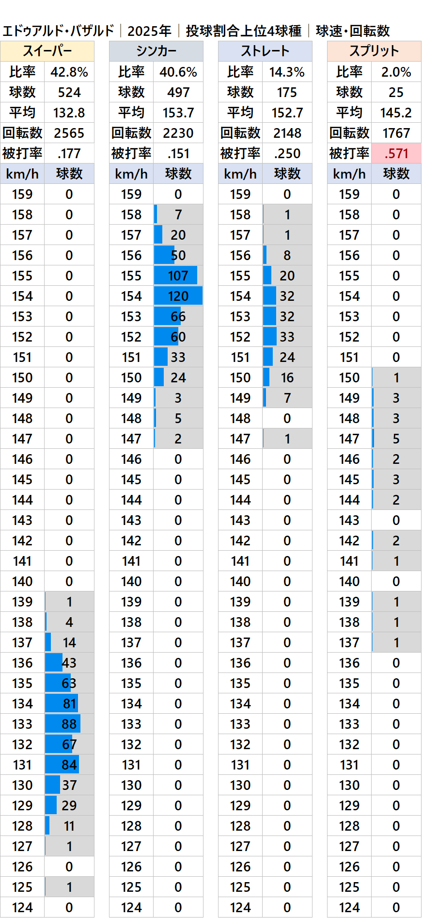 マリナーズのエドゥアルド・バザルド(バザード)投手(右投/ベネズエラ)の2025年シーズンの球種別の投球割合・球速・回転数・被打率の情報です。