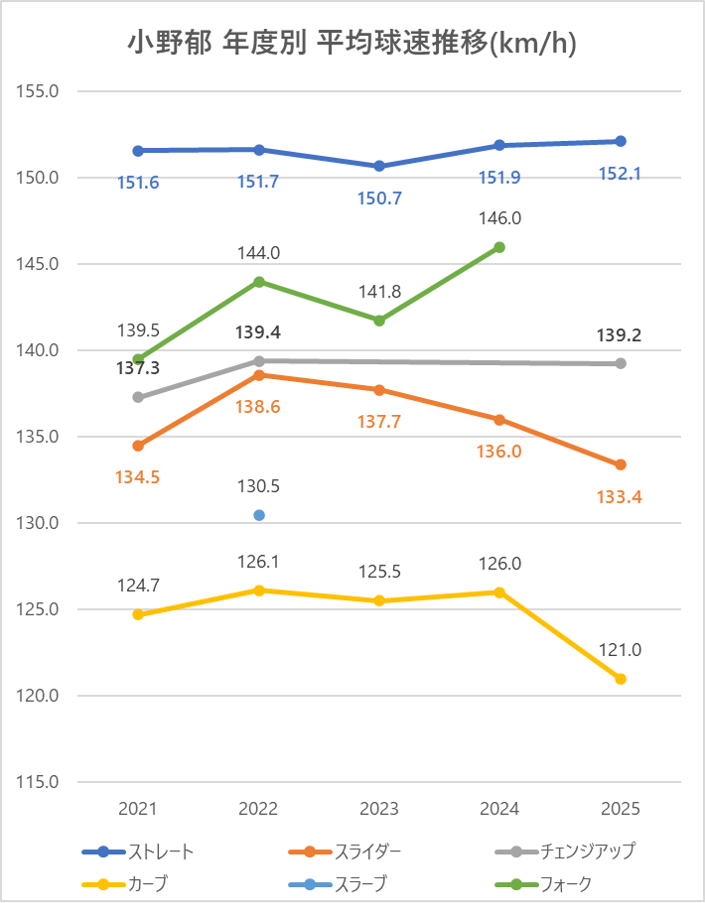 ストレートの平均球速は2024年と比較して0.2km/h上昇。