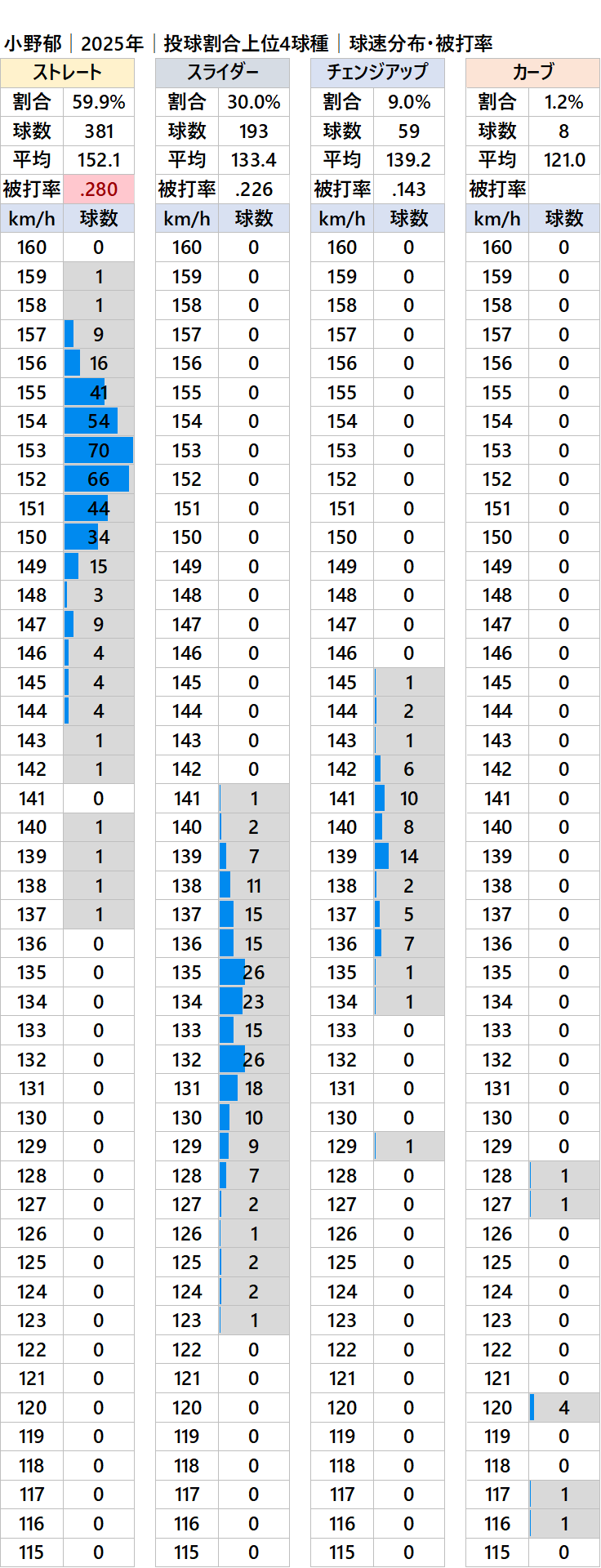 千葉ロッテの小野郁投手(右投)の2025年シーズンの球種別の投球割合・球速・被打率の情報です。