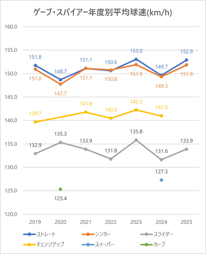 ストレート(4シーム)の平均球速は2024年と比較し3.2km/h上昇。