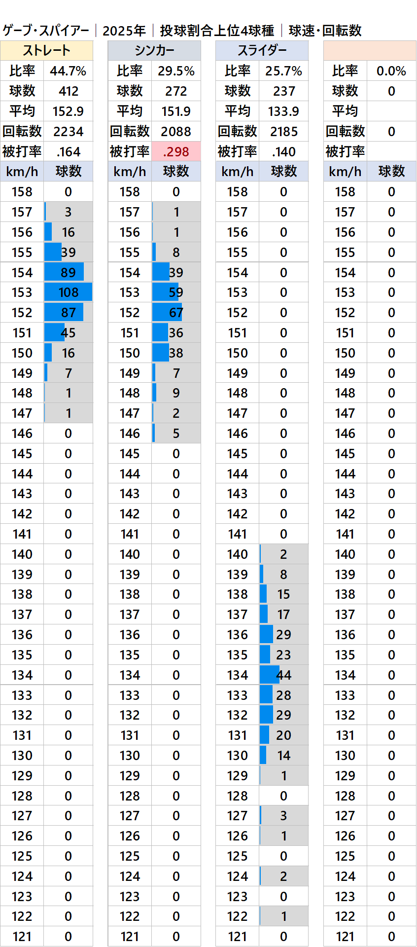 球種別球速・投球比率・被打率・回転数