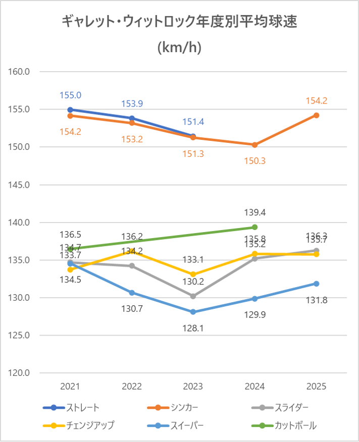 2025年はリリーフに専念した影響により前年と比較しシンカーの平均球速が約4km/h上昇。