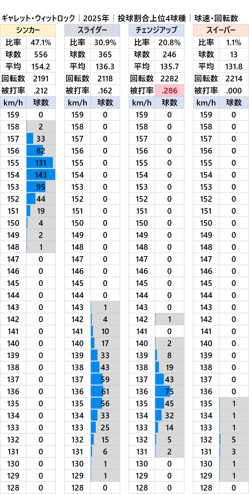 レッドソックスのギャレット・ウィットロック投手(右投/米国)の2025年シーズンの球種別の投球割合・球速・回転数・被打率の情報です。