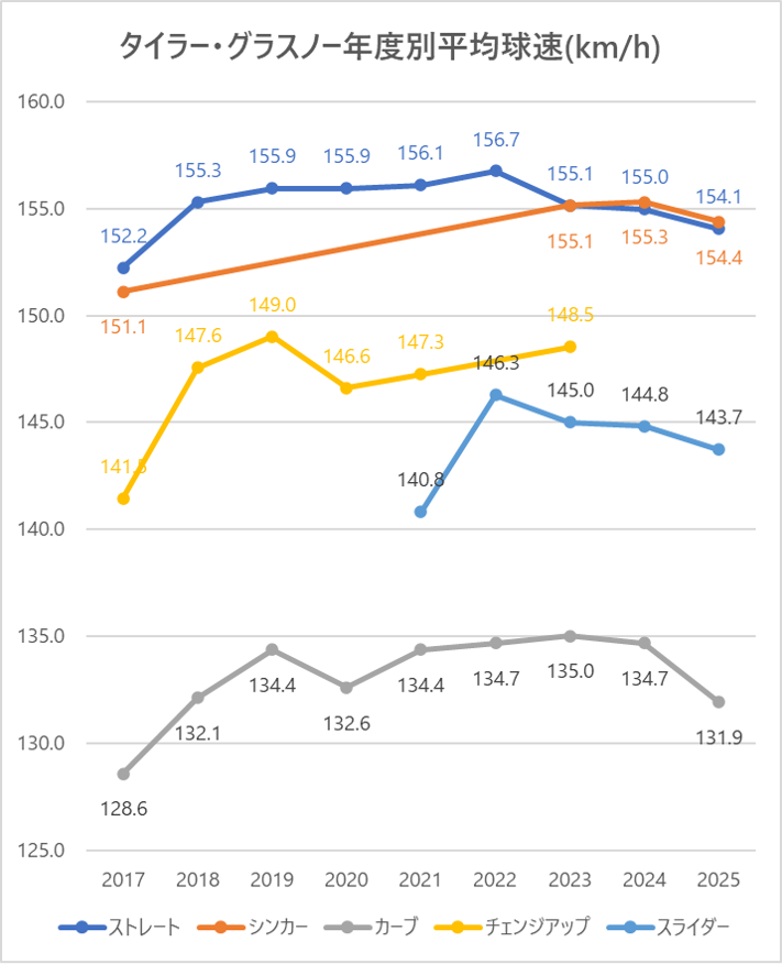 2023年と比較し、4シームの平均球速は0.9km/h低下。