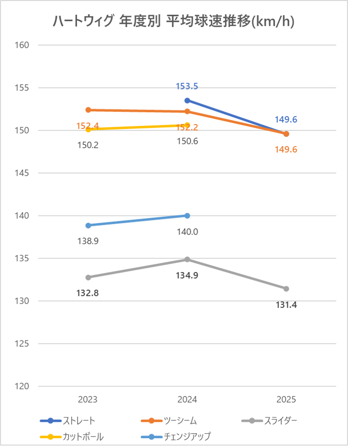 MLBに在籍していた2024年と比較しストレートの平均球速は3.9km/h低下。