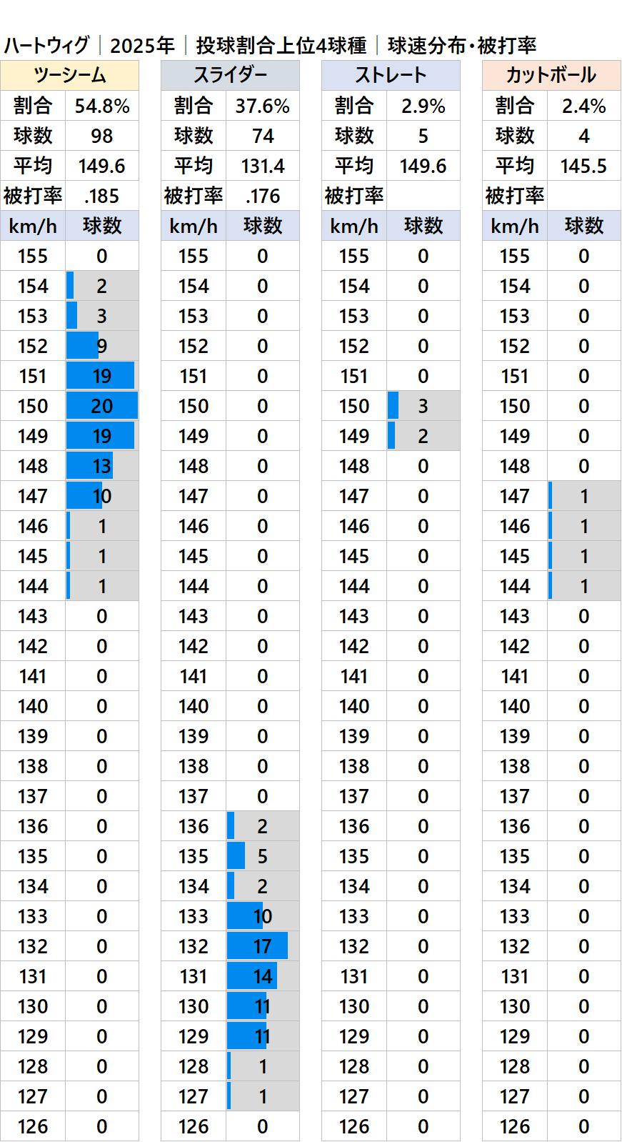 阪神のハートウィグ投手の2025年シーズンの球種別の投球割合・球速・被打率の情報です。