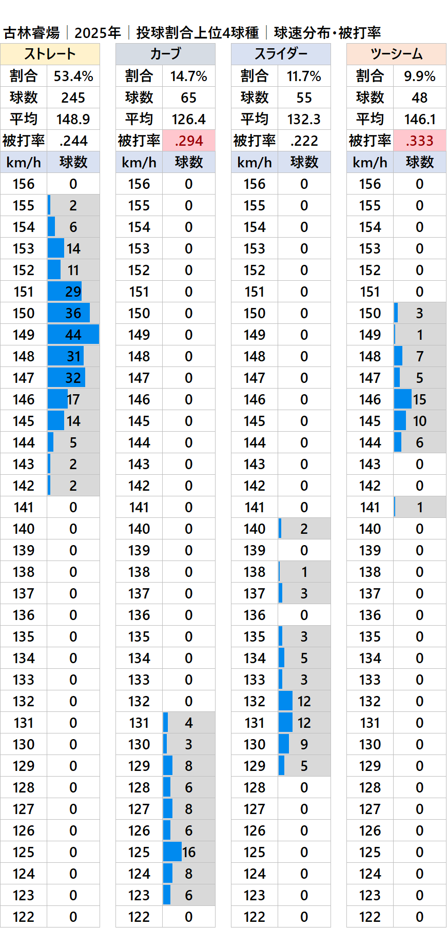 日本ハムの古林睿煬投手の2025年シーズンの球種別の投球割合・球速・被打率の情報です。