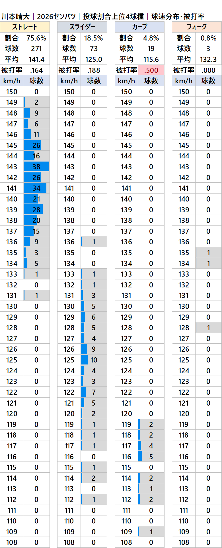 2026センバツ 球種別球速・投球割合・被打率