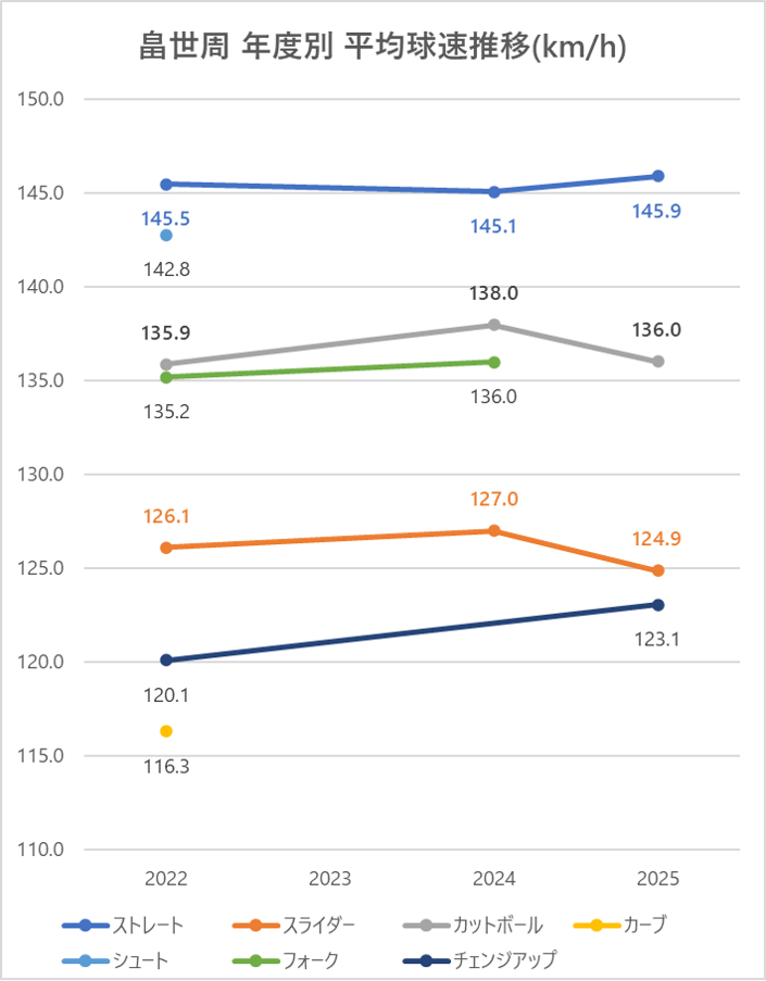 ストレートの平均球速は2024年と比較し0.8km/h上昇。。