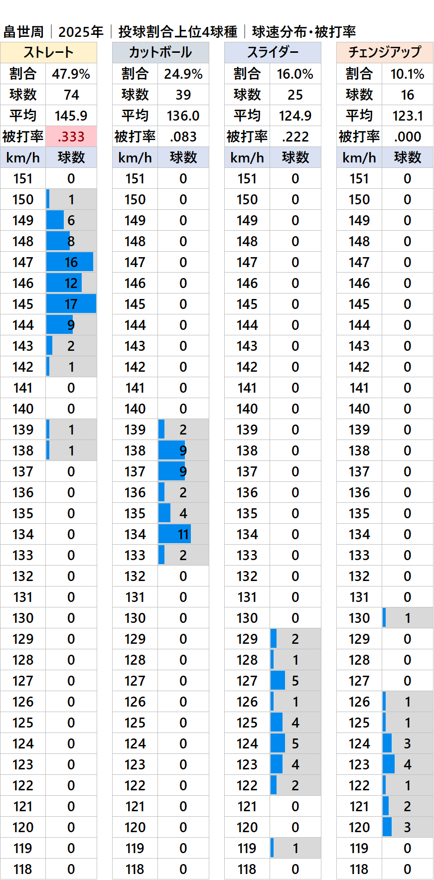 阪神の畠世周投手の2025年シーズンの球種別の投球割合・球速・被打率の情報です。