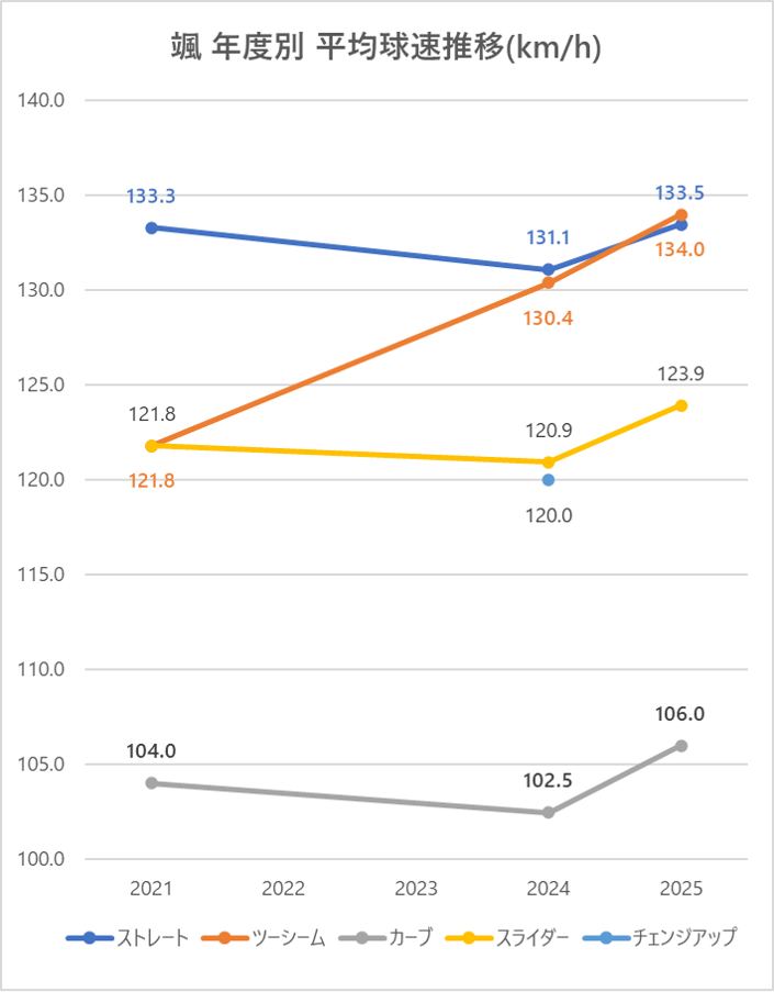 ストレートの平均球速は2024年と比較し2.4km/h上昇。