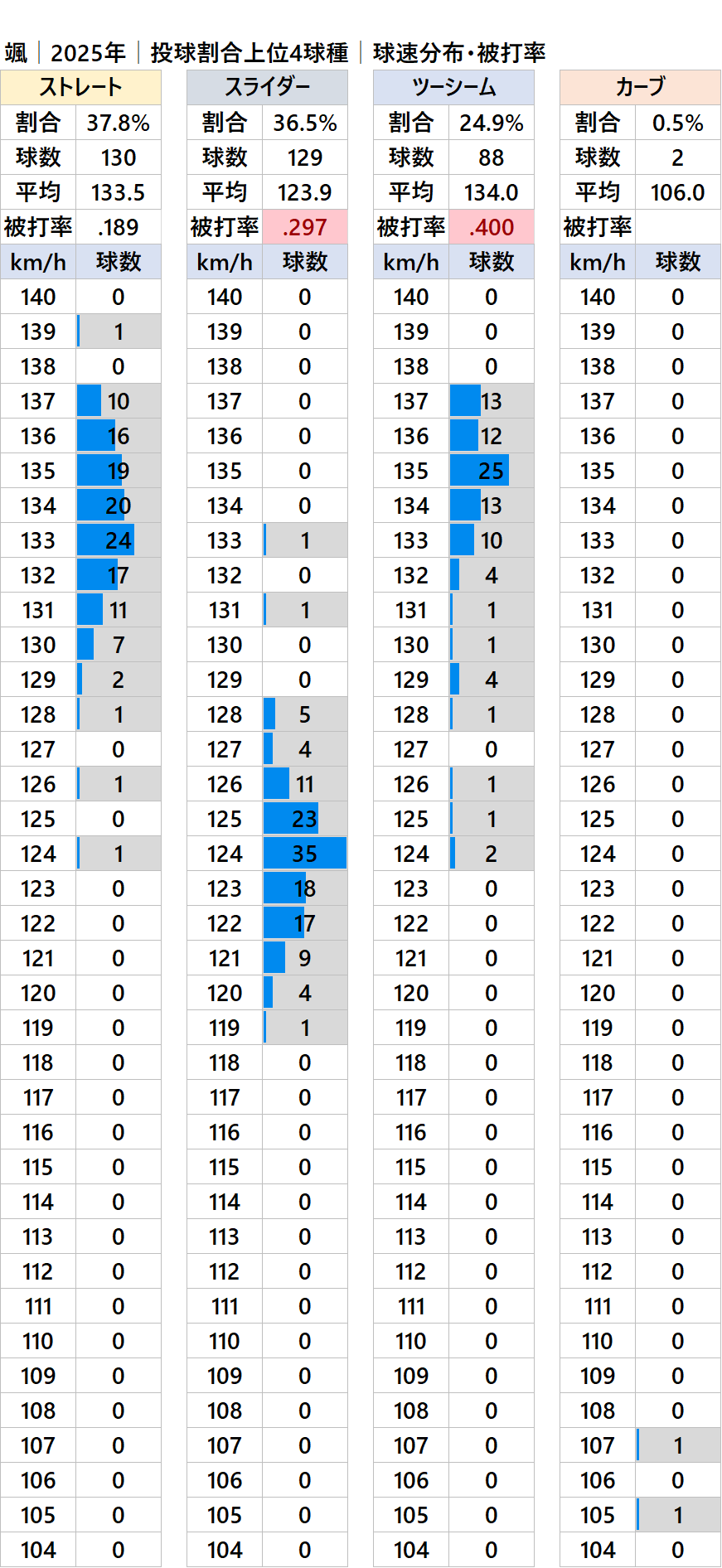 DeNAの颯投手の2025年シーズンの球種別の投球割合・球速・被打率の情報です。