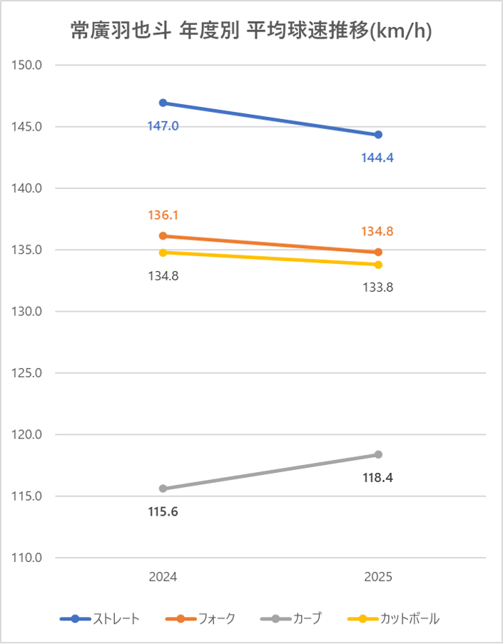 2024年と比較しストレートの平均球速は2.6km/h低下。
