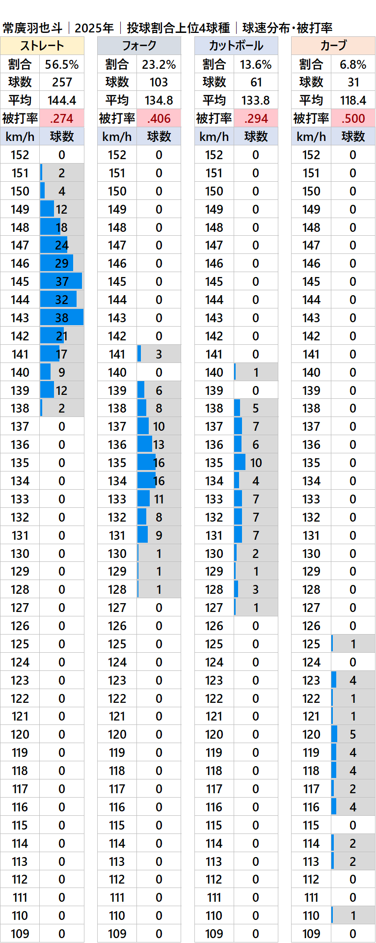 広島の常広羽也斗投手(右投)の2025年シーズンの球種別の投球割合・球速・被打率の情報です。