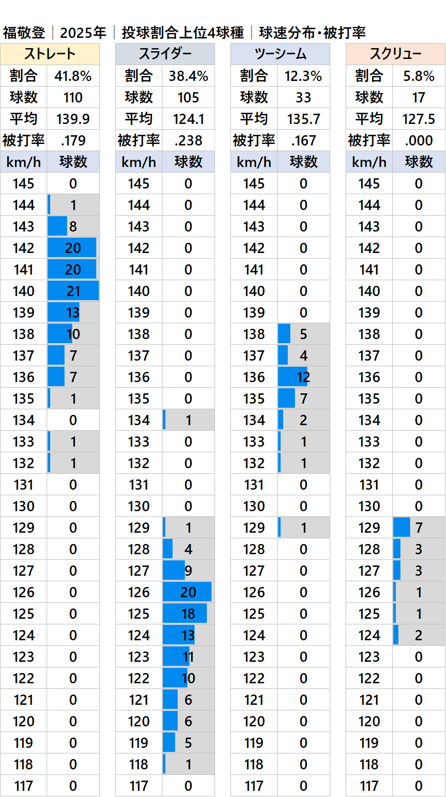 中日の福敬登投手(左投)の2025年シーズンの球種別の投球割合・球速・被打率の情報です。