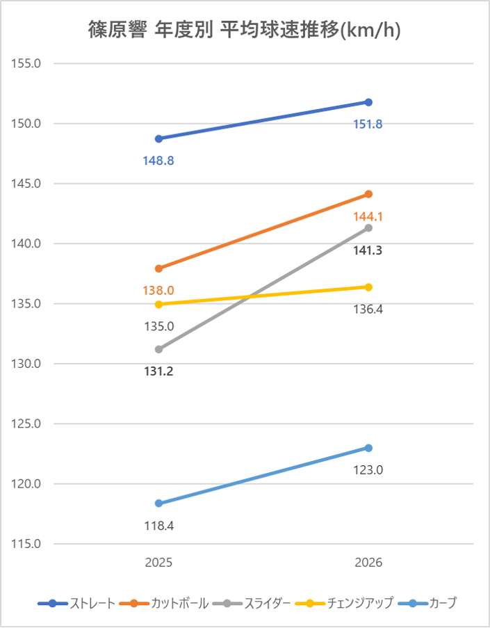 先発だった2025年と比較しストレートの平均球速は3km/h上昇。