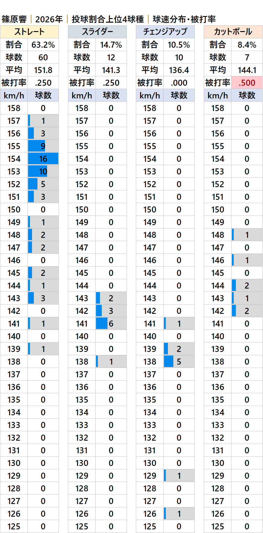 西武の篠原響投手(右投)の2026年シーズンの球種別の投球割合・球速・被打率の情報です。