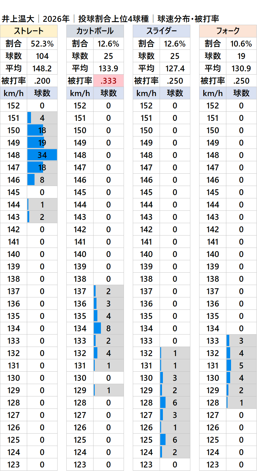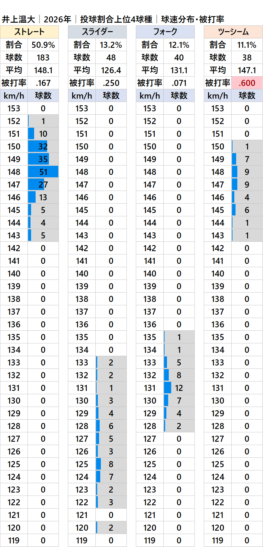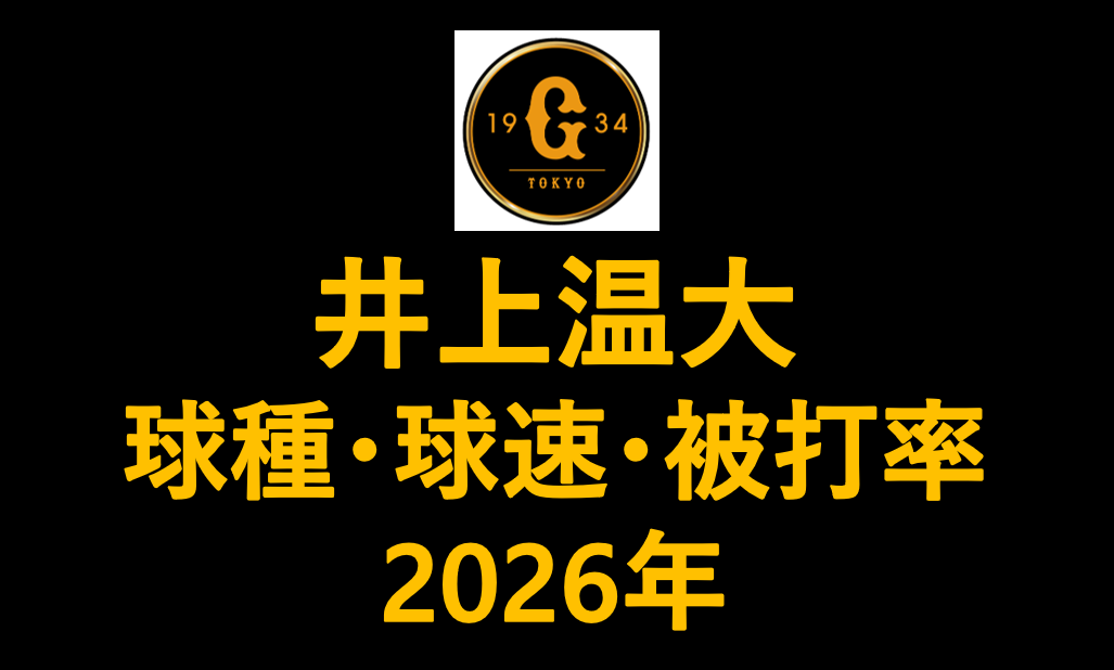 巨人の井上温大投手(左投)の2026年シーズンの球種別の投球割合・球速・被打率の情報です。