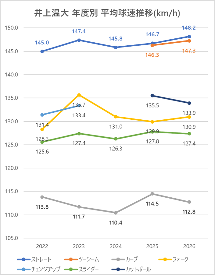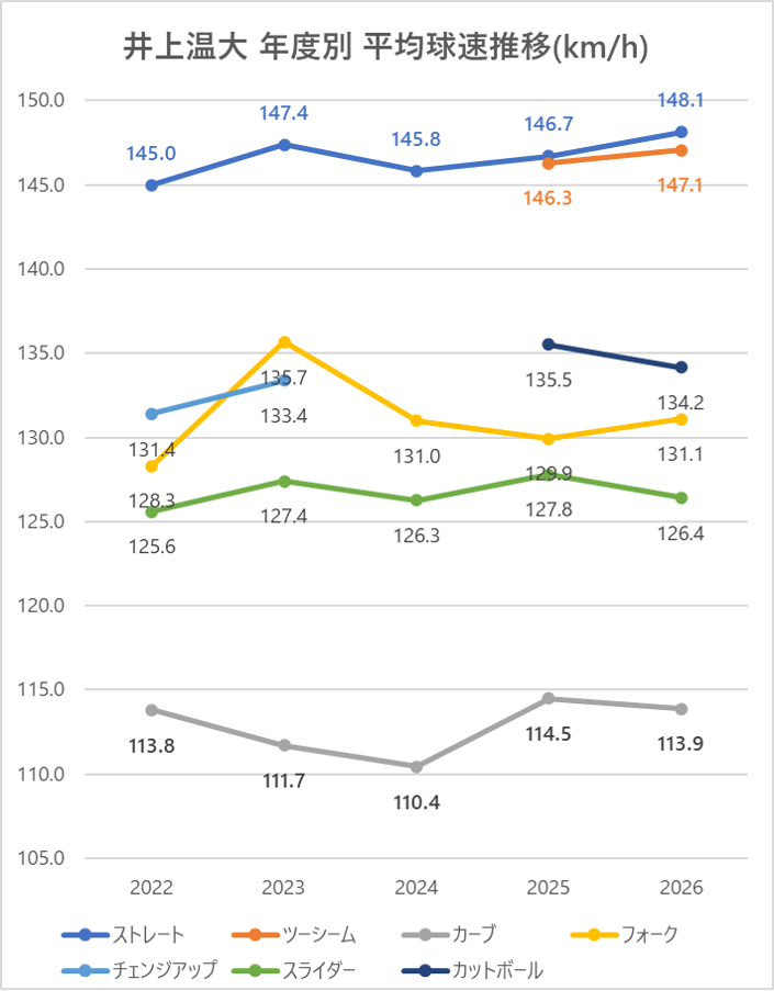 2025年と比較し、ストレートの平均球速は1.5km/h上昇。