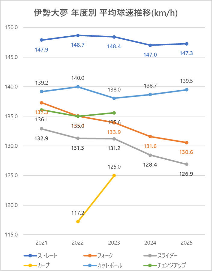 ストレートの平均球速は2024年と比較し0.3km/h上昇。