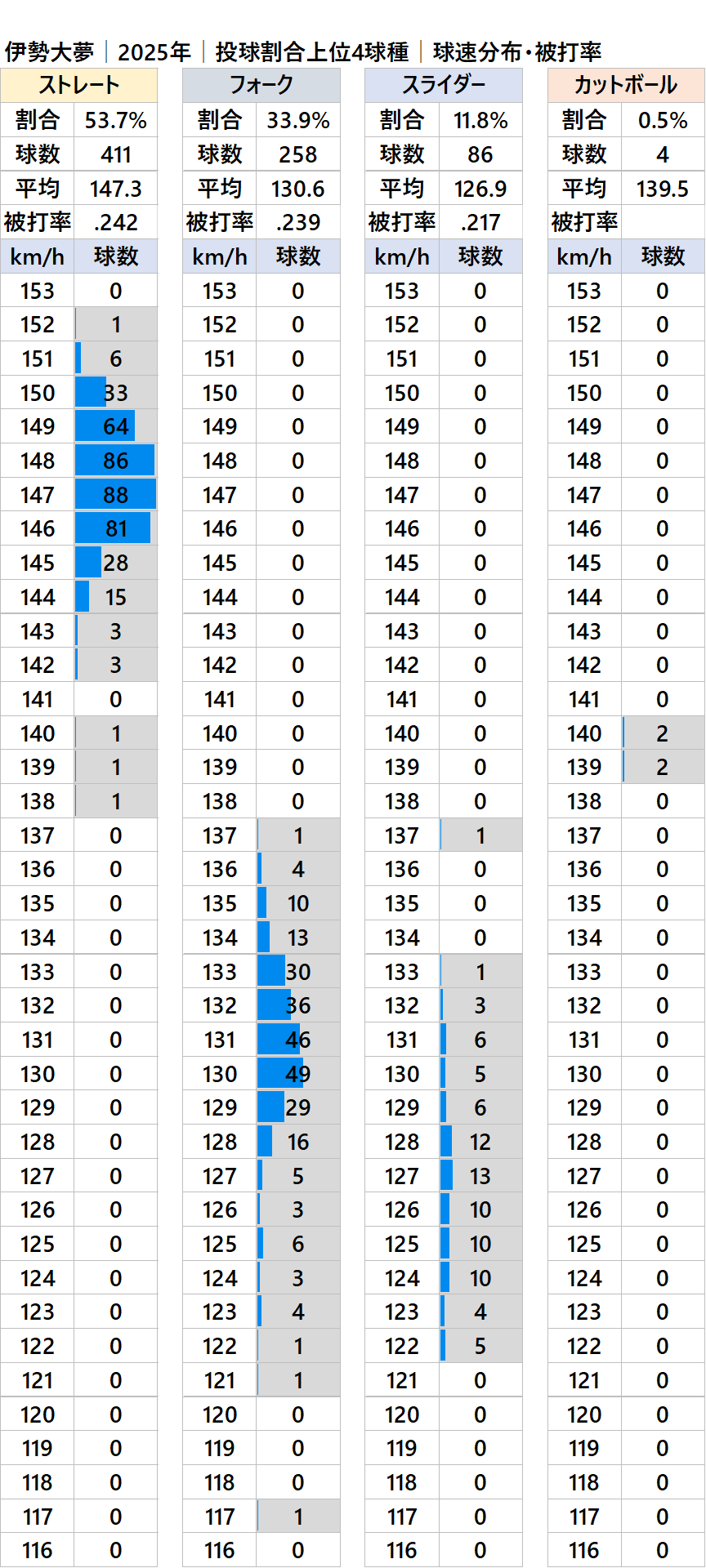 DeNAの伊勢大夢投手の2025年シーズンの球種別の投球割合・球速・被打率の情報です。