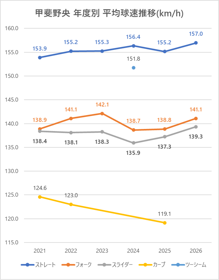 2025年と比較しストレートの平均球速は1.8km/h上昇。