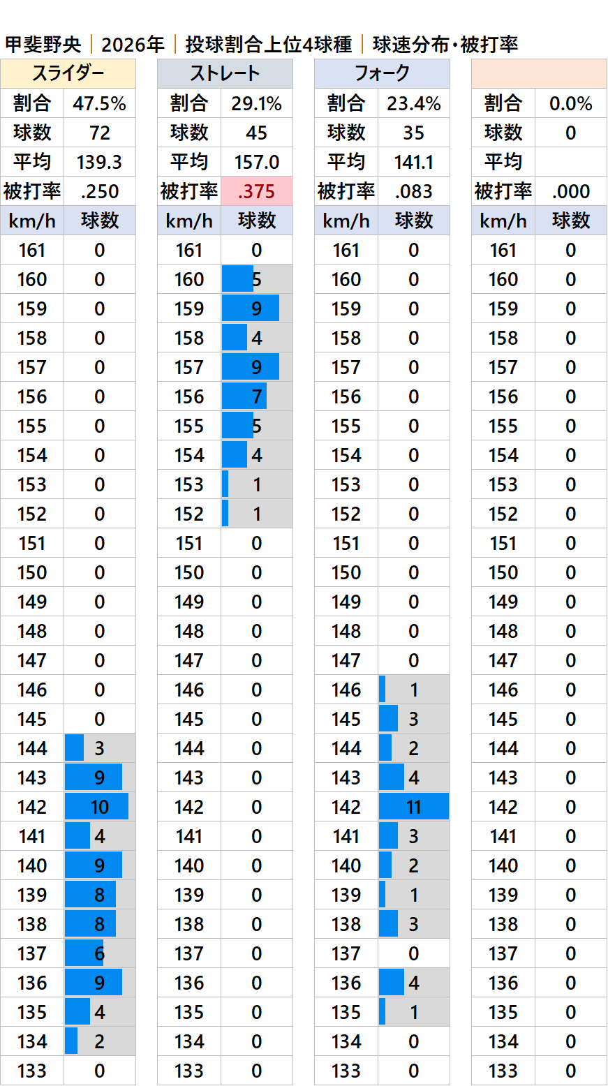 球種別球速・投球割合・被打率