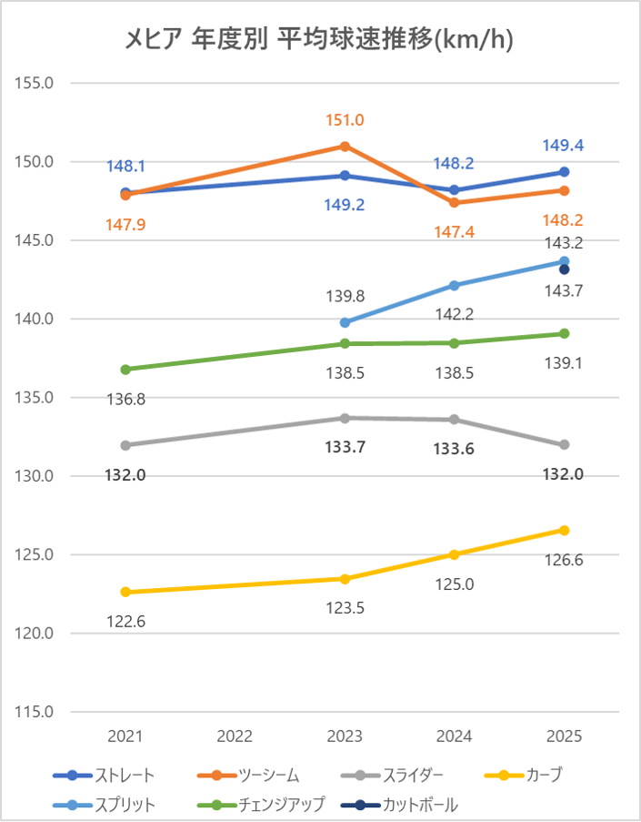 ストレートの平均球速は2023年と比較し1.2km/h上昇。
